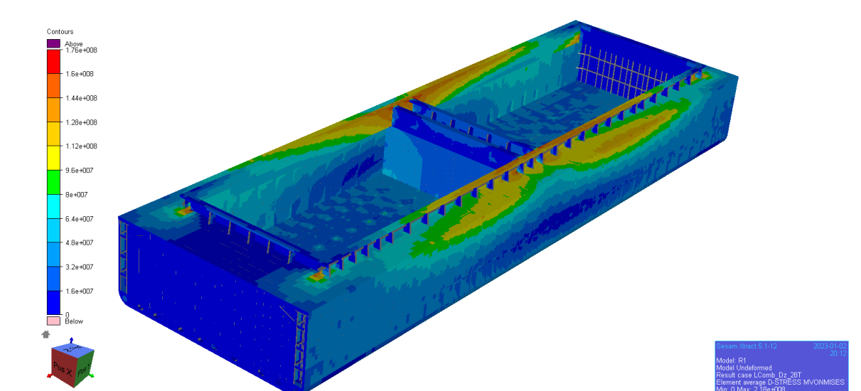 Maritechs cung cấp dịch vụ phân tích FEA trong việc tính toán sức bền toàn tàu, sức bền cho các thiết bị trên tàu như nắp hầm hàng, trụ cẩu, cầu dẫn…
